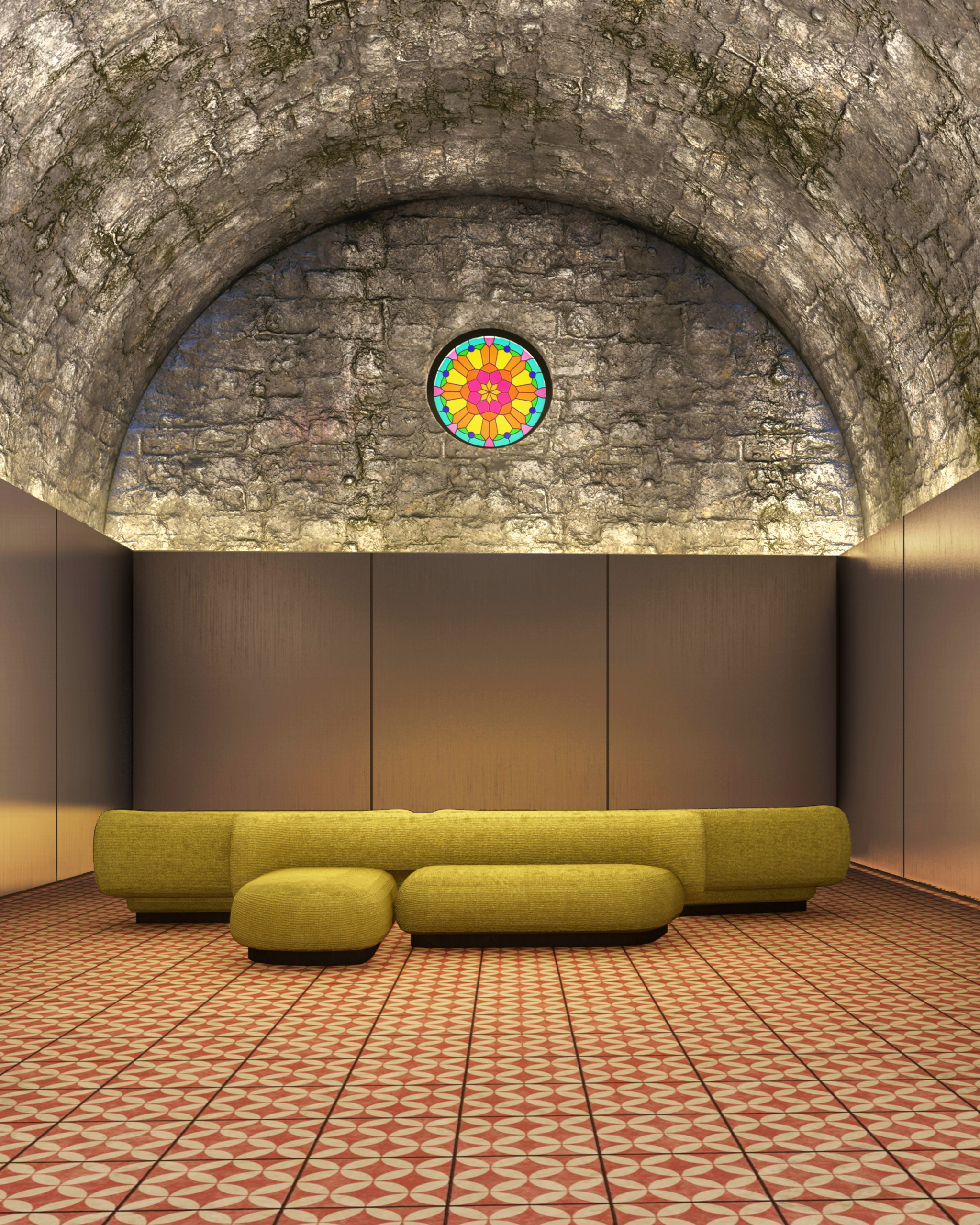 The Vault is a conceptual interior project designed to embody MALLOUHI*’s vision, where the authentic meets the bold. The intervention takes place in an old stone vault, reimagined as a waiting area with a single seating element. To address the condition of the walls, stainless steel panels were introduced, extending down to the base of the vault. These panels create a subtle, blurred reflection that mediates between the bold yellow of the couch and the original stone and flooring of the space. The design approach was intentionally minimal, preserving the authenticity of the setting while highlighting its traditional character.